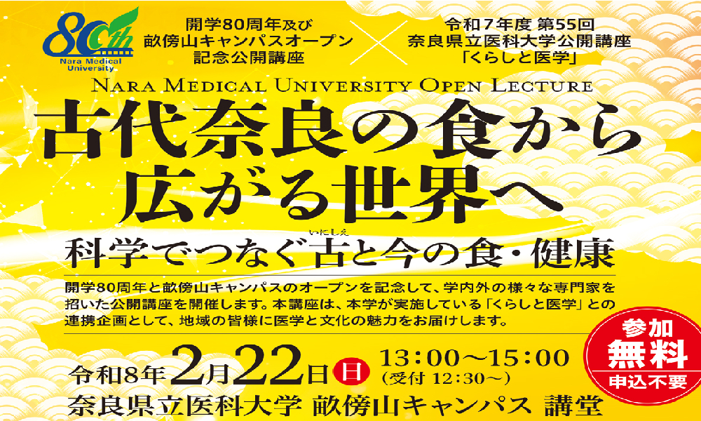 開学80周年及び畝傍山キャンパスオープン記念公開講座✕令和7年第55回「くらしと医学」公開講座のご案内 日時 令和8年2月22日(日) 場所 奈良県立医科大学 畝傍山キャンパス講堂※交通アクセスは、本学HPをご覧ください。 https://www.naramed-u.ac.jp/uni...